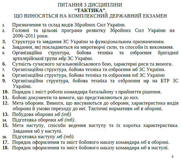 Комплексний державний екзамен проводиться за програмою, яка містить у собі вузлові питання програми навчальної дисципліни «Тактика».